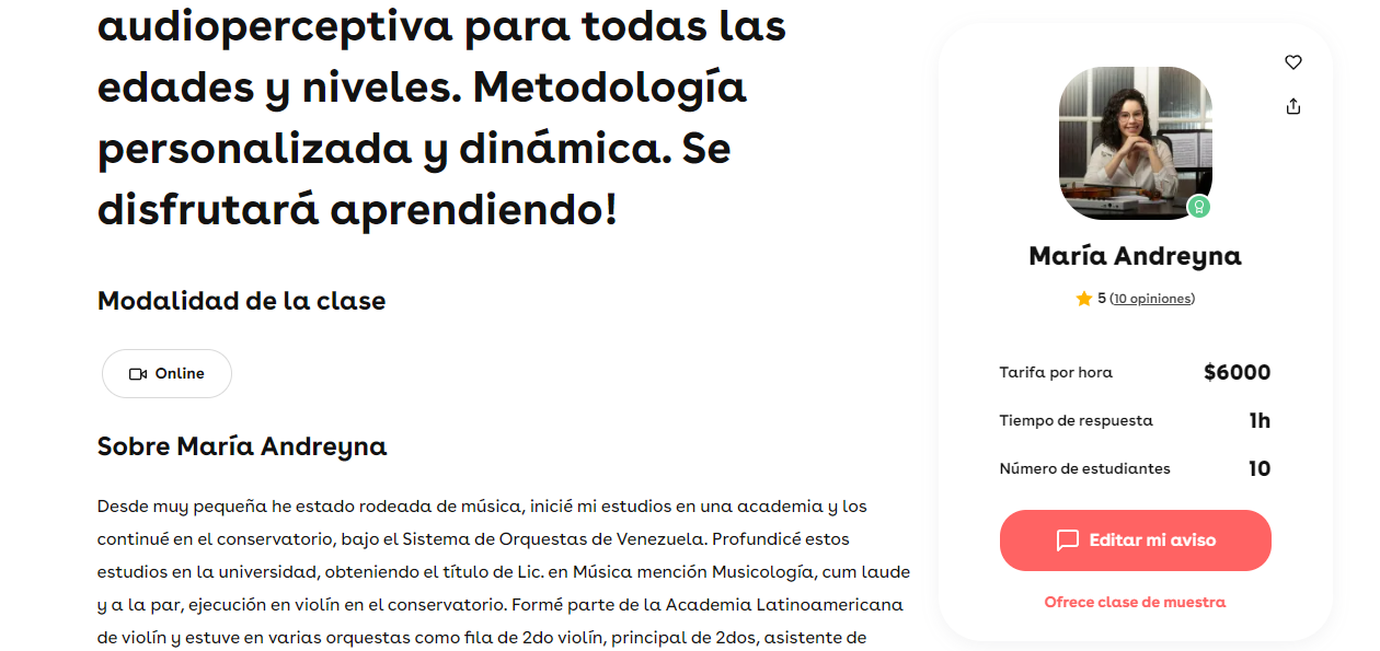 Así que hoy voy a hablar un poco de esas páginas y cómo usarlas. Muy importante que en cada uno de las páginas webs amerita crear un perfil donde tendrás que colocar tu experiencia, tus estudios (puedes subir certificados, títulos y demás) lo cual ayudará a tener una distinción en tu usuario 😉; deberás describir cómo son tus clases, tu dinámica de enseñanza y a cuál público está dirigido, permiten colocar el valor de tu clase e información si haces precios especiales por paquetes de hora y no es obligatorio pero le da un plus enorme 🔝 tener algún vídeo hablando/tocando o enseñando, ya que permites que la persona que está buscando conectar con un profesor, pueda verte/escucharte y así ir con mayor confianza a contactarte. Y hablando de ello, pedirán tu número telefónico y correo pero la página nunca se lo dará al estudiante o a la persona que está en la búsqueda de un profesor, ya que es algo que debes decidir tú, según tu comodidad (luego doy otras recomendaciones sobre esto).